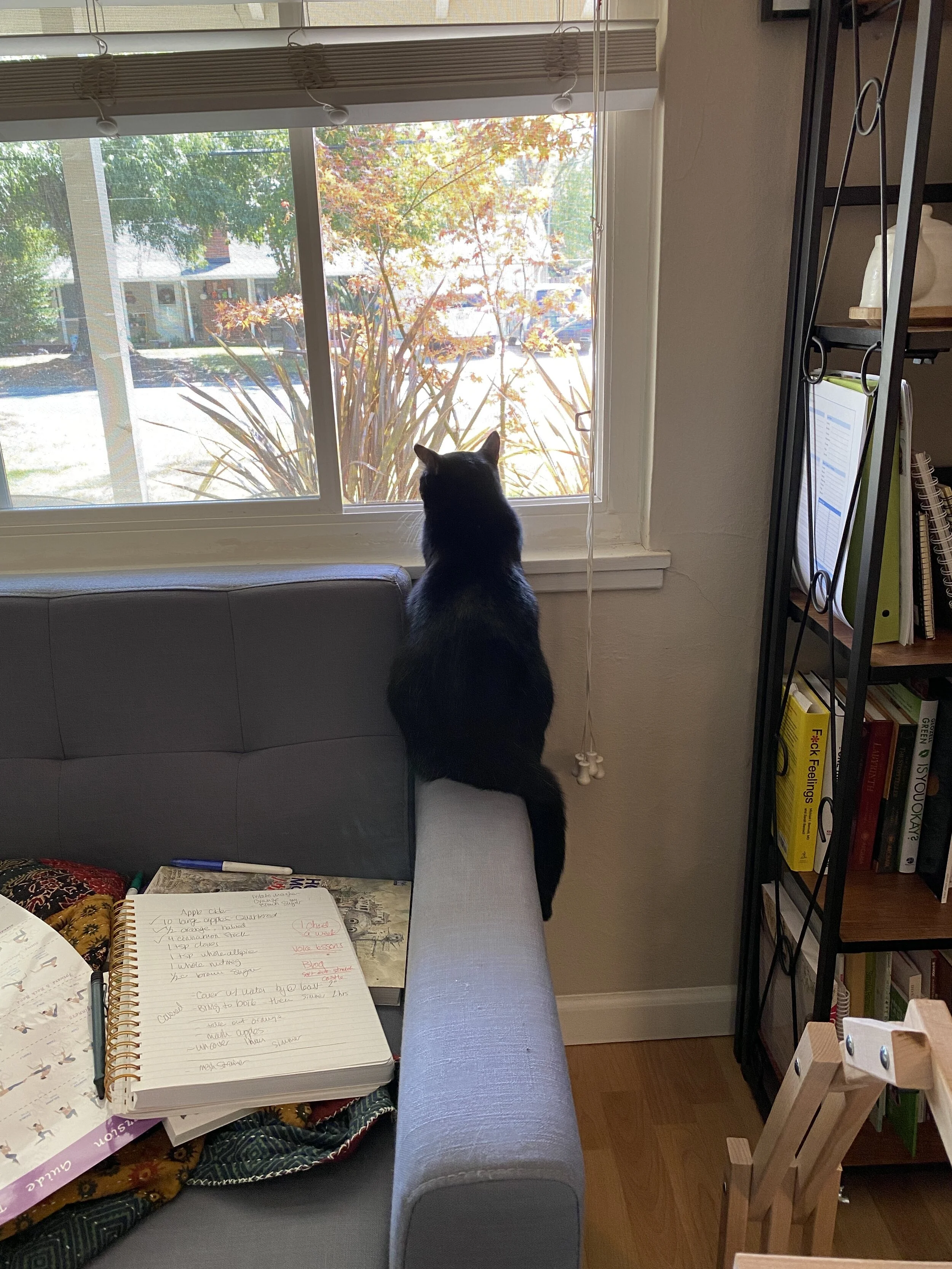Since we got the ceiling all fixed up, I decided to rearrange the furniture around to make the cafe area a bit more comfortable. Now, I have the couch close to the table. I was worried that the cats would not be able to access the window easily. I was wrong.