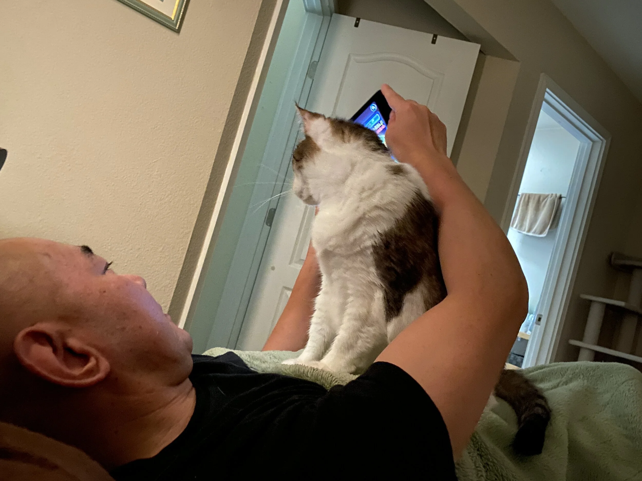 Tucker is starting to sleep on the cat post we had in Japan again.