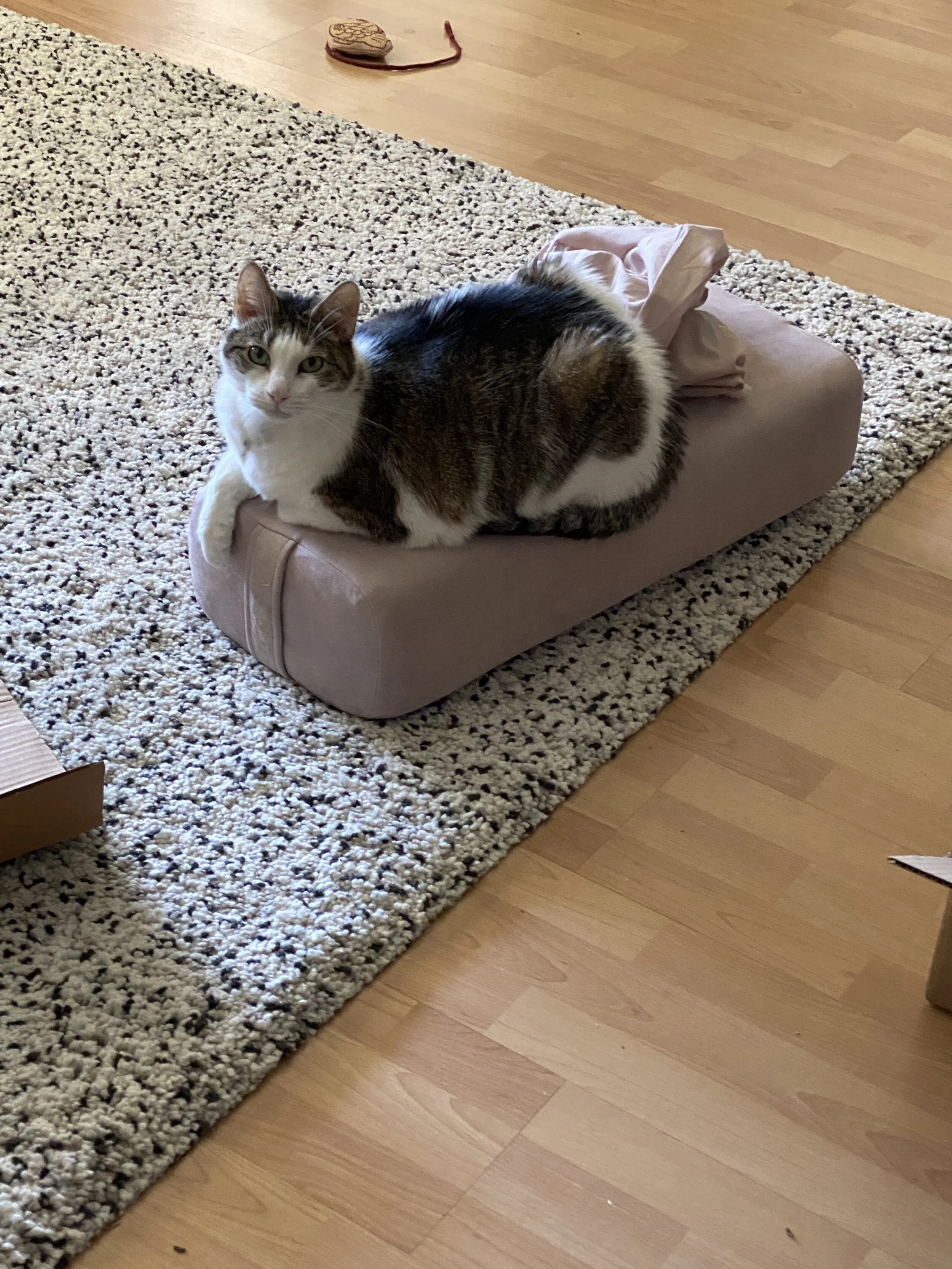 I bought a bolster cushion that got lost in the mail. The people that I bought it from were kind enough to send me a replacement. If the other one somehow makes it here, I have to figure out how to send it back. Anyway, as soon as I took it out Chiyo sat on it, but Tucker sat on it through the evening into the night.